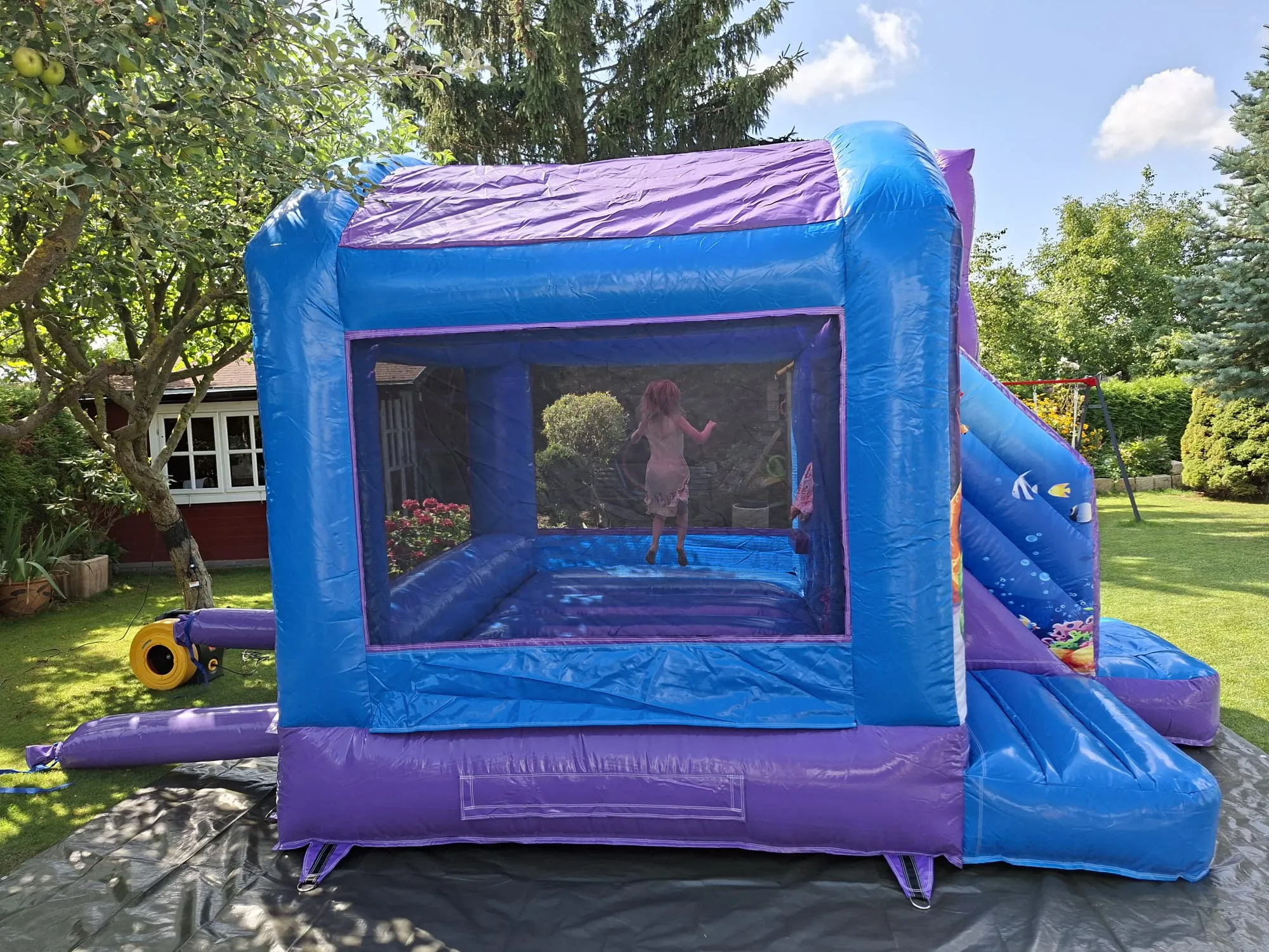 - ACHTUNG: Die Hüpfburg soll nicht vollständig durchnässt werden, insbesondere nicht an den Nähten. Sonst dringt Wasser ins Innere. Und auch die vollständige Trocknung der Nähte dauert sehr lange.