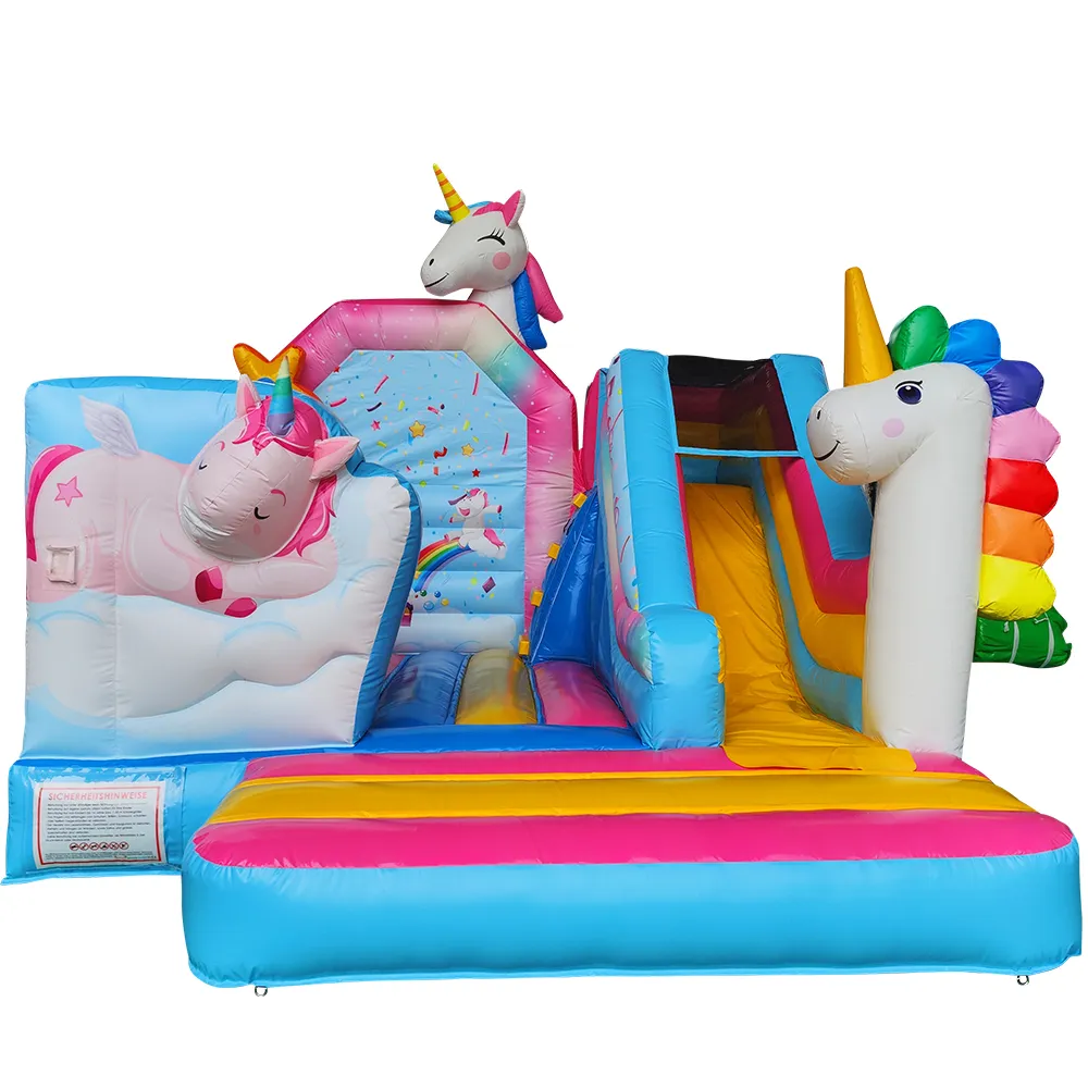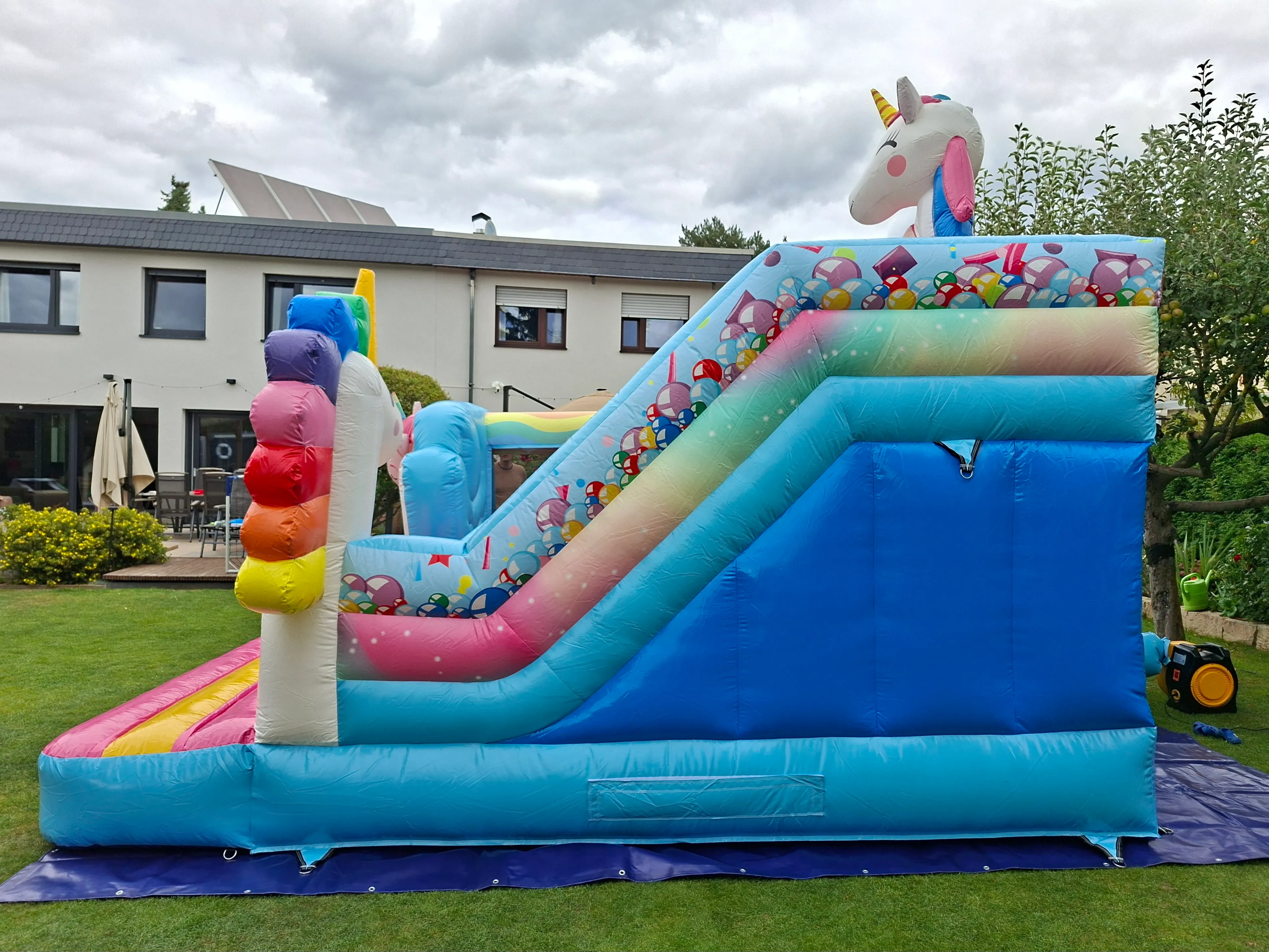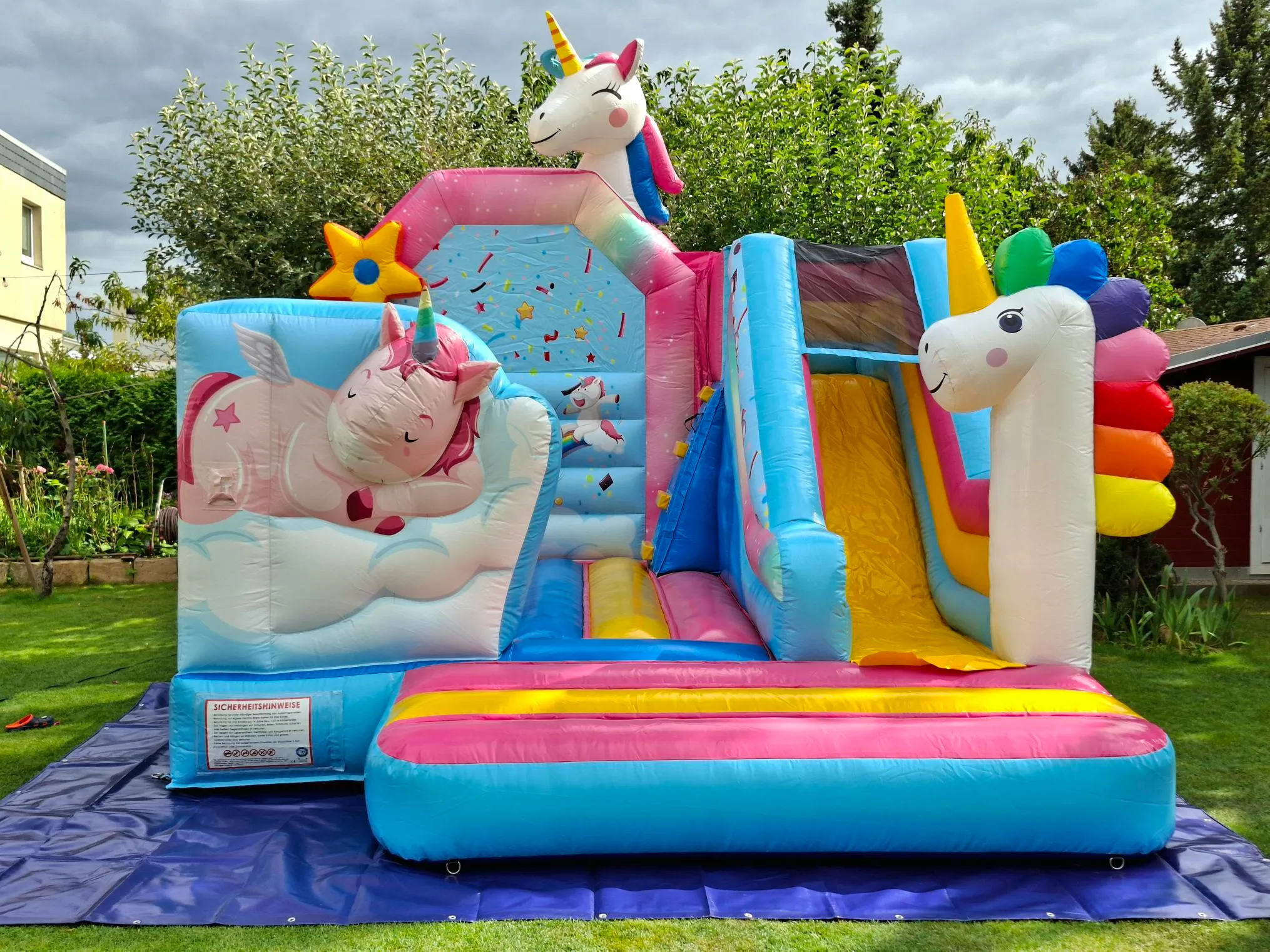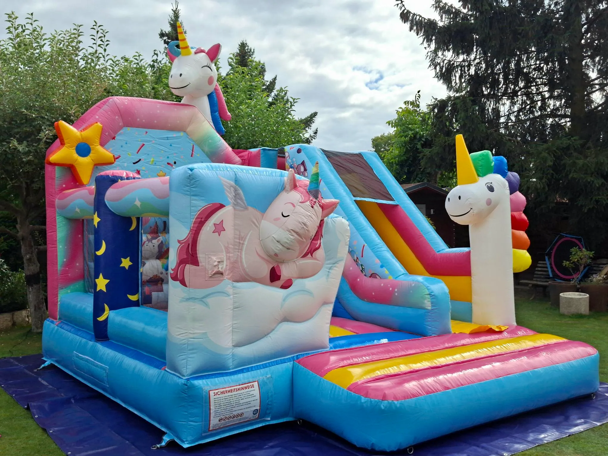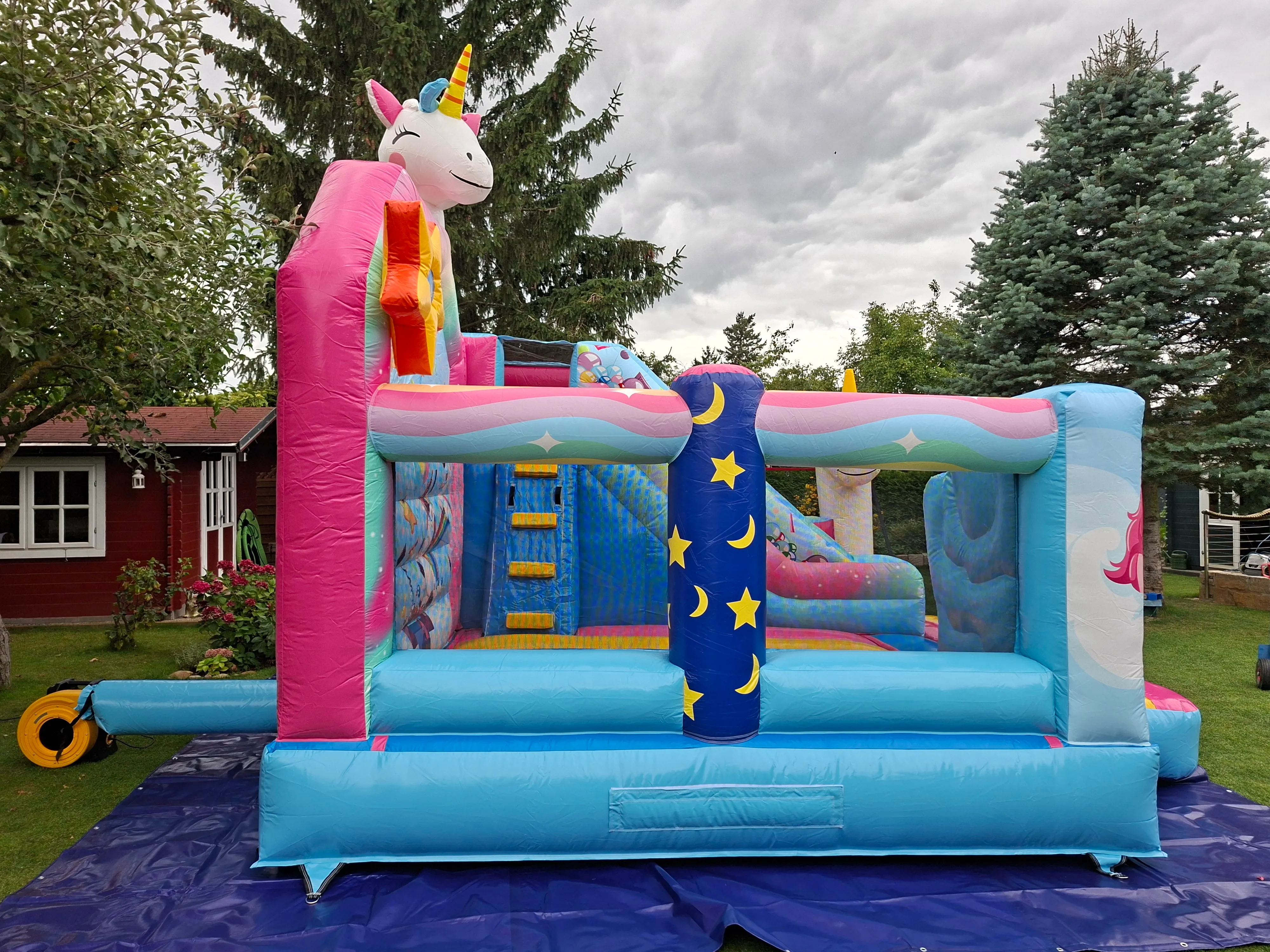 Unsere flauschigen Einhörner laden ins bunte Einhornland zum Springen und Rutschen ein. Die Kombination aus Hüpfburg und Rutsche ist hier besonders attraktiv gestaltet, da die Rutsche in der Hüpfburg startet und auch wieder endet. Die kleinen Gäste müssen die Burg also nicht verlassen und somit bleibt die Hüpfburg schmutzfrei. Die liebevolle Gestaltung und knalligen Farben runden das Design ab und machen dieses einmalig detailverliebt. Das Dach über der Rutsche und Sicherheitsnetze an allen Öffnungen macht die Hüpfburg sehr sicher bei allen Einsätzen. Darüber hinaus bieten die Netze einen guten Blick auf die spielenden Kinder.